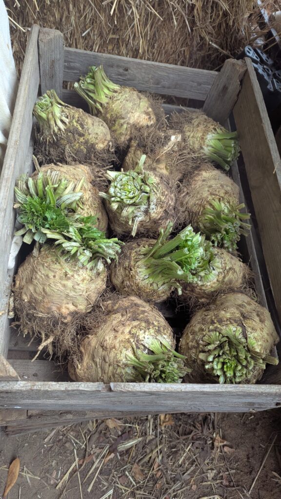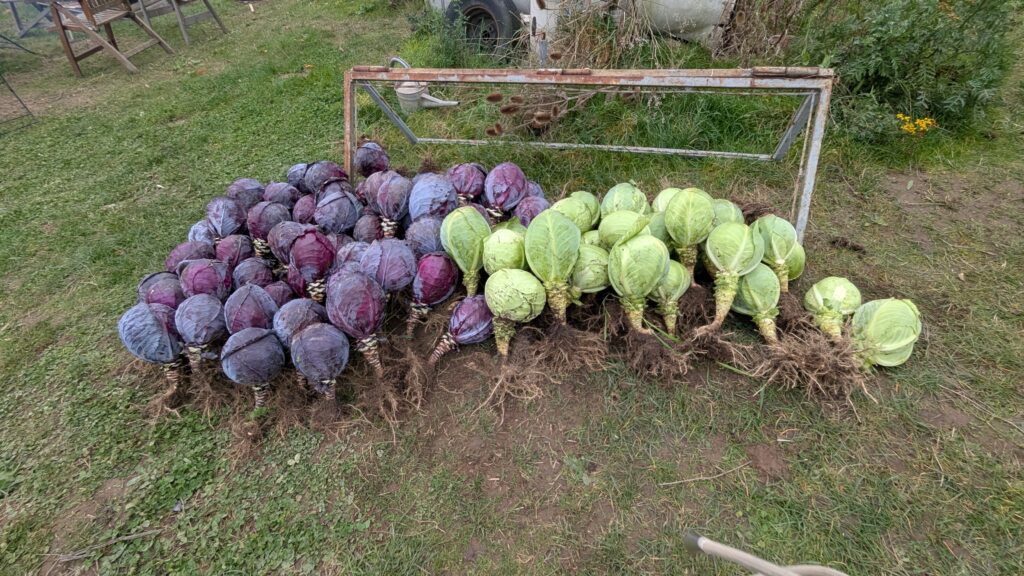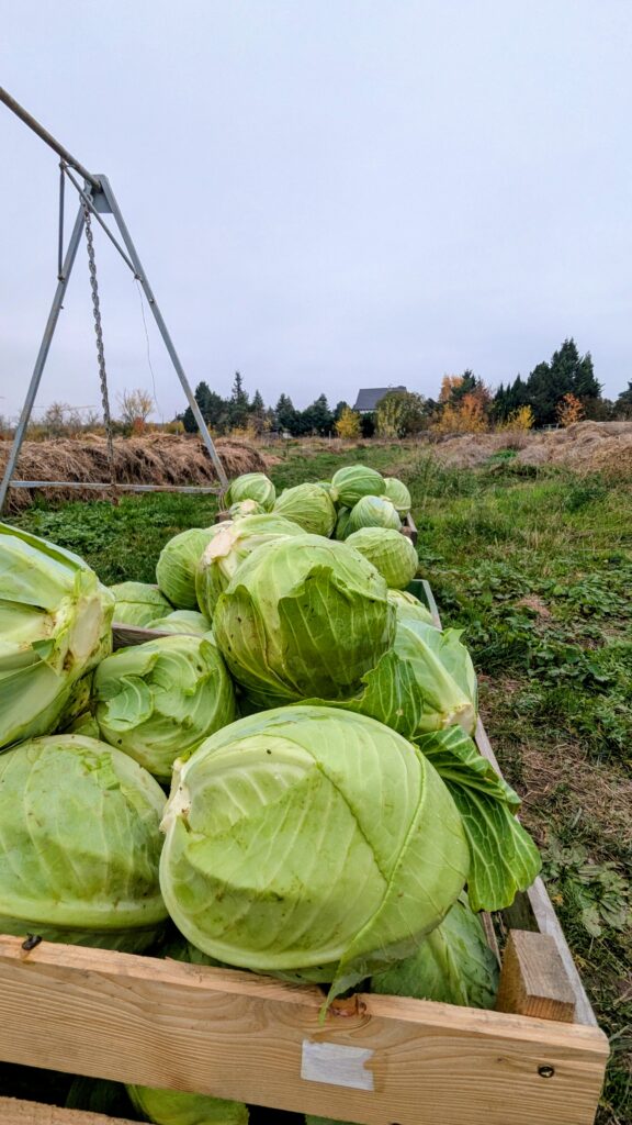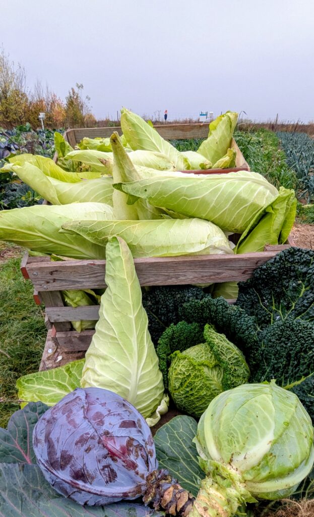 Anfang November haben wir Vereinsmitglieder uns zur Gemeinschaftsaktion für die Knollen- und Kohlernte getroffen. Gemeinsam machten wir uns daran, Knollensellerie, Spitzkohl, Weißkohl, Rotkohl und Wirsing zu ernten und das Feld wieder mit Mulchmaterial zu bedecken. Das gehört zu unserem Anbausystem, damit das vielfältige Bodenleben und die gebundenen Nährstoffe vor dem Frost des Winters geschützt sind und uns der geschützte Boden auch kommendes Jahr reiche Ernte beschert – ganz ohne chemischen Dünger oder Hybridsaatgut.